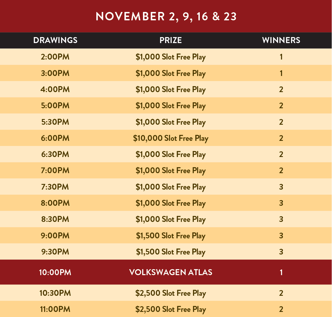 November 2, 9, 16 & 23 / Volkswagen Atlas + $60K in Slot Free Play