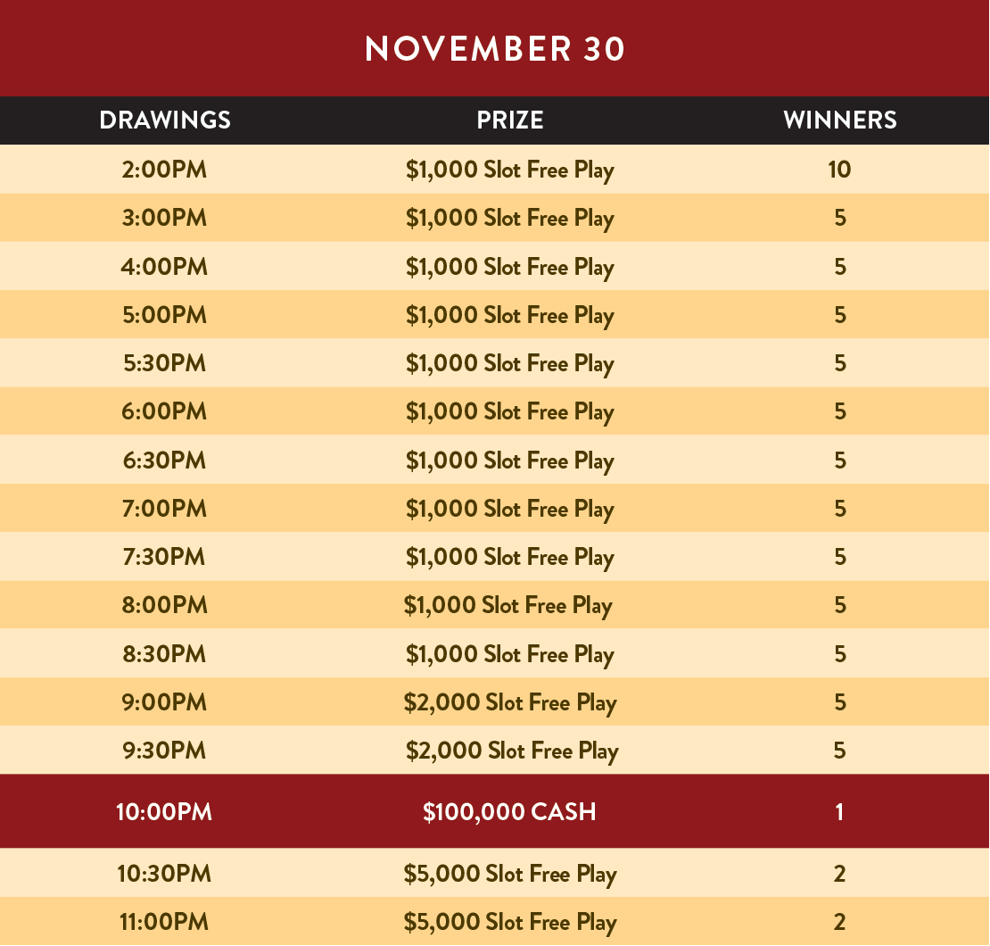 November 30 / $100,000 Cash Grand Prize + $100K in Slot Free Play